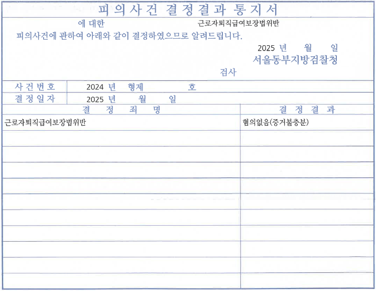 ※ 노동법 전문기관인 노동청에서 혐의를 인정한 사건의 결론을 뒤집어 검찰 혐의없음(증거불충분) 처분을 받아내는 것은 드문 일입니다.