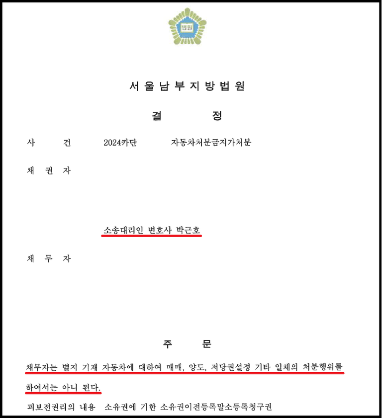 의뢰인을 기망한 성명불상자는 연락이 두절되었고, 차량의 명의는 성명불상자가 유도한 중고차상사 앞으로 이전되어 있어, 자동차 처분금지가처분을 잡아야 다음 조치를 할 수 있는 상황이었습니다.