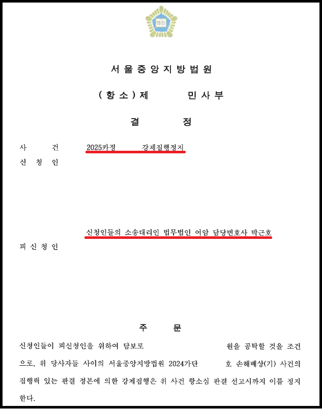 제1심에서 의뢰인이 판결 송달 자체를 인지하지 못한 상태였기 때문에, 우선 긴급하게 제1심 가집행 판결의 효력을 정지시켜야 다음 조치를 취할 수 있는 상황이었습니다.