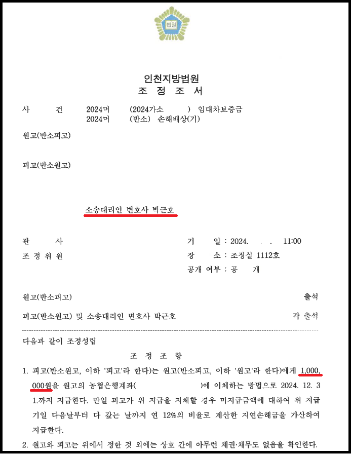 그 결과 법원에서는 의뢰인에게 상징적인 금액인 '100만원'만 반환하는 조건으로 조정을 진행해 주셨고, 상대방 역시 본안소송으로 돌아가면 본인이 패소할 것을 알고 이러한 조정안에 동의하여 주었습니다.