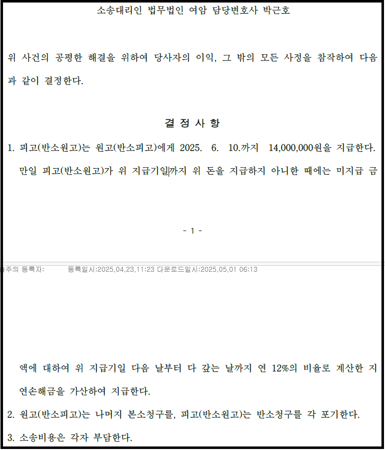 나아가 제반 사정들을 모두 감안하여 상대방의 청구를 대폭 감액하고 약 1/3 정도 수준에서 판결을 내려 주셨고, 양 당사자가 이러한 판결을 수용하여 사건이 원만히 마무리 되었음은 물론입니다.