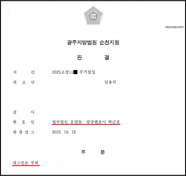 적극적인 변론의 결과, 법원에서는 의뢰인에 대하여 주거침입죄가 성립한다고 보기 어렵다며 무죄 판결을