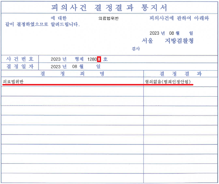 ※ 의료법위반 사건에서는 형사사건 결과에 따라 행정제재(면허정지)가 진행될 수 있기 때문에, 형사사건에서 제대로 대응하여 무혐의 결정을 받는 것이 중요합니다.