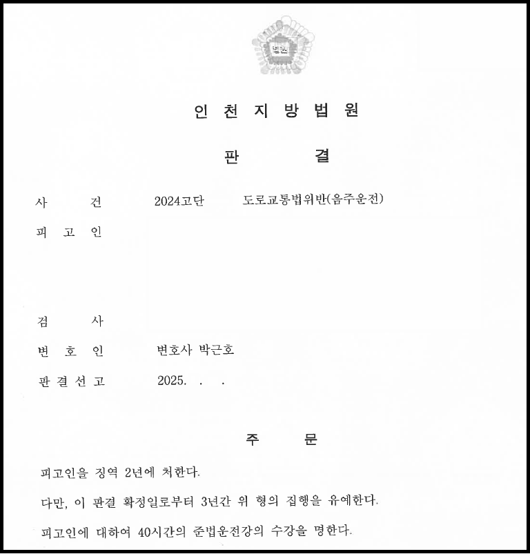 2, 3회도 아니고, 무려 5회째 음주운전이다보니, 재판부에서는 의뢰인에 대하여 실형을 선고하는 방안을 가장 많이 고민하셨을 것이나, 끝내 변호인의 의견을 따라서 집행유예 판결을 선고해 주셨습니다.