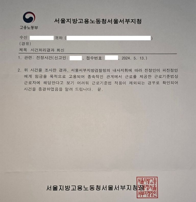 그렇게 피를 말리는 7개월간의 조사 끝에, 근로감독관님이 "진정인이 피진정인에게 임금을 목적으로 고용되어 종속적인 관계에서 근로를 제공한 근로기준법상 근로자에 보기 어렵다"는 이유로 혐의없음 종결 처리를 하여 주셨음은 물론입니다.