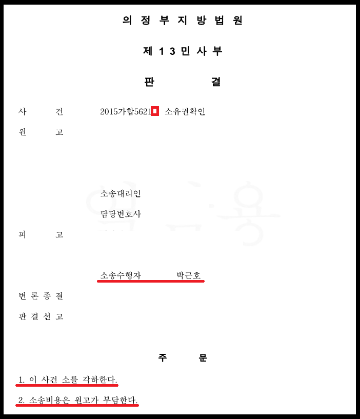 법원에서는 쌍방 당사자의 공방을 면밀하게 점검하신 다음, 피고가 점유취득시효를 완성하였고 원고에게는 확인판결을 받을 법률상 이익이 없다는 이유로 소각하 판결을 하여 주셨습니다.