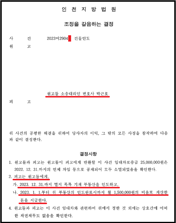 법원에서도 명도의무의 발생에 대하여 다툼의 여지가 없다고 보시고, 차임을 적당히 조정하여 사건을 신속하게 종결할 수 있도록 조정에 회부하여 주셨습니다(인천지방법원 2023가단21200*).