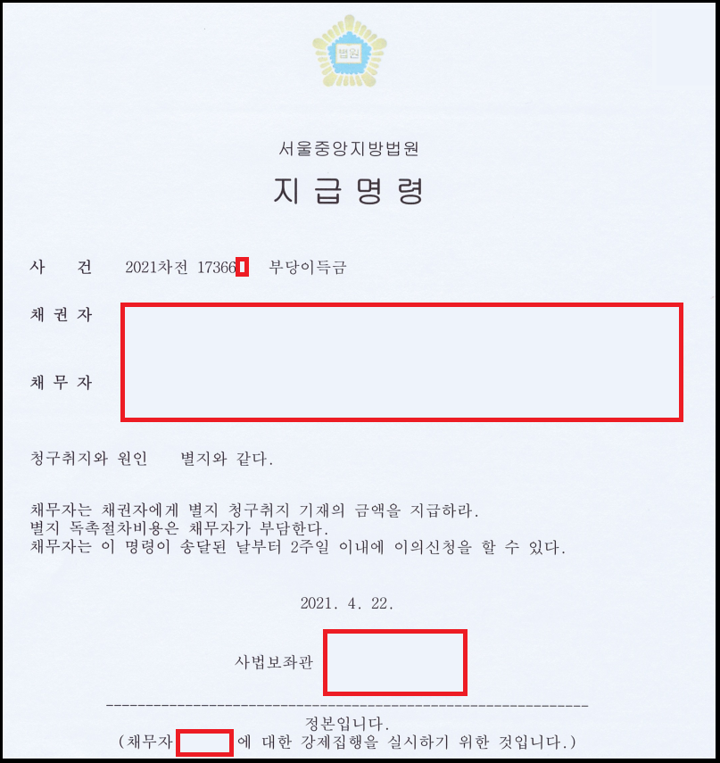 법원은 제가 신청한 내용을 모두 받아들여 곧바로 지급명령을 발령하여 주셨고, 저는 확정된 지급명령을 바탕으로 본압류 및 추심을 진행하여(서울중앙지방법원 2021타채11481*), 착오송금액을 무사히 돌려받을 수 있었습니다.