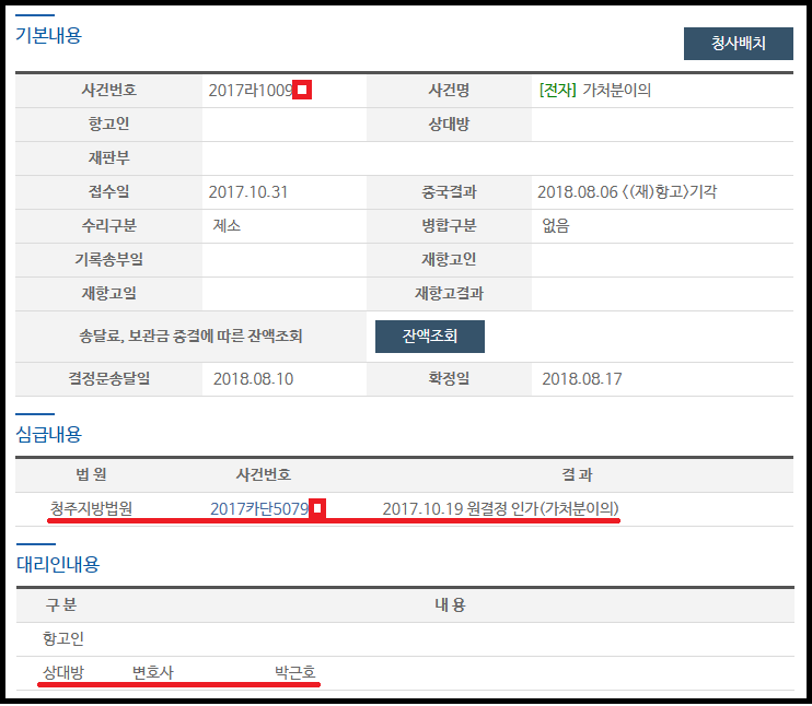 법원에서는 상대방이 제기한 불복절차에서도 제 주장들을 그대로 받아들여 주셔서, 이의신청 및 (재)항고를 모두 기각해 주셨습니다(청주지방법원 2017라1009*).