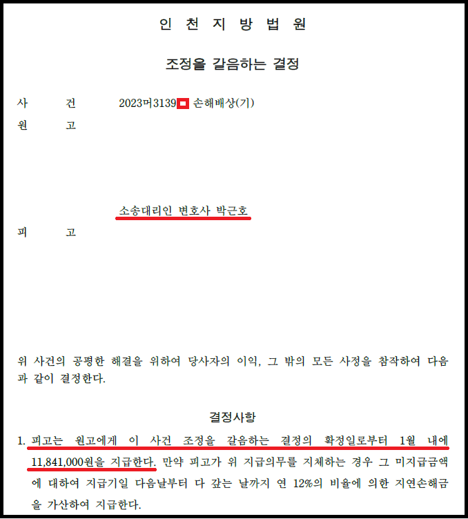 금액을 다소 조정하여 상대방에게 11,841,000원을 지급하라는 강제조정결정을 하여 주셨으며(인천지방법원 2023머3139*), 당사자들이 이러한 강제조정안을 받아들이고 조정금액을 지급하여 분쟁이 신속하게 마무리될 수 있었습니다.