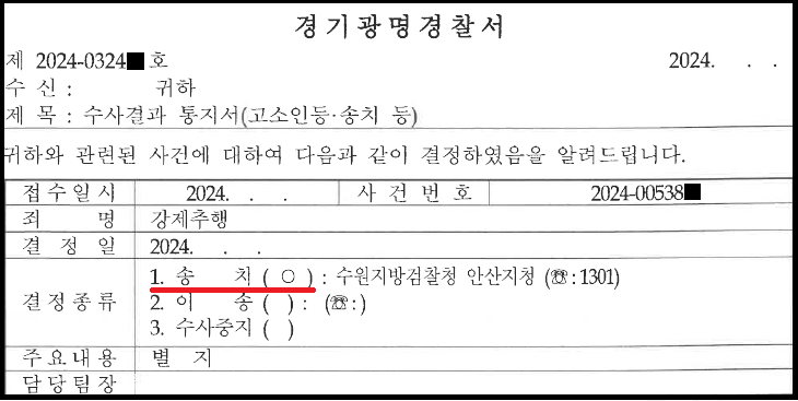 경찰에서는 제가 작성해서 제출한 서류 및 의견을 신중하게 검토하신 끝에, 직장내 성추행 혐의를 인정하여 상대방을 검찰에 송치하는 처분을 내려 주셨습니다.