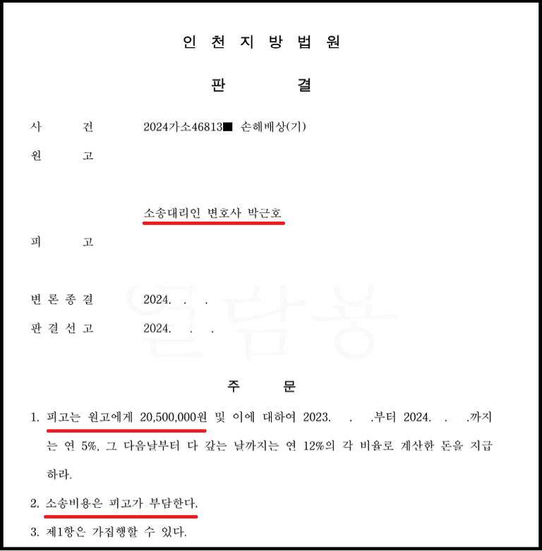 재판부에서도 수개월동안 본 사건에 대하여 신중하게 검토하신 끝에, 청구금액 2,050만원을 전액 인용하는 판결을 하여 주셨습니다.